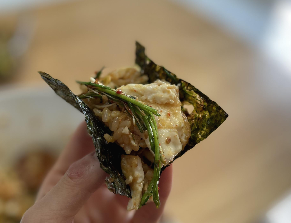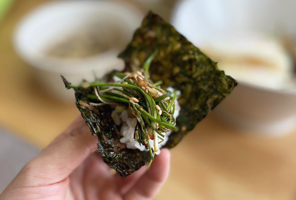 구운 곱창김에 간장계란밥도 싸 먹습니다.
