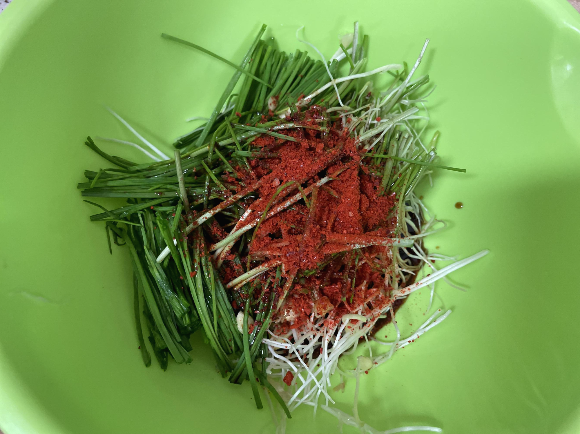 볼에 자른 달래를 담아 진간장과 고춧가루를 넣고,