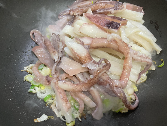 오징어가 80% 정도 익으면 야채를 몽땅 넣고 빠르게 볶아줍니다.