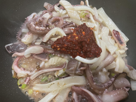 백종원 오징어볶음 레시피에서는 너무 뻑뻑하다면 물을 조금만 추가하라고 하더라고요. 저는 넣지 않았습니다.