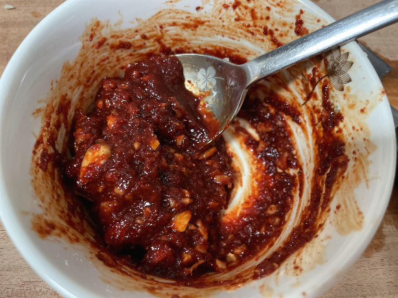 고추장 1큰술, 고춧가루 2큰술, 진간장 2.5큰술, 다진 마늘 1큰술