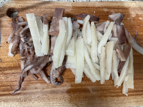 적당히 해동된 오징어는 먹기 좋은 크기로 썰어줍니다.